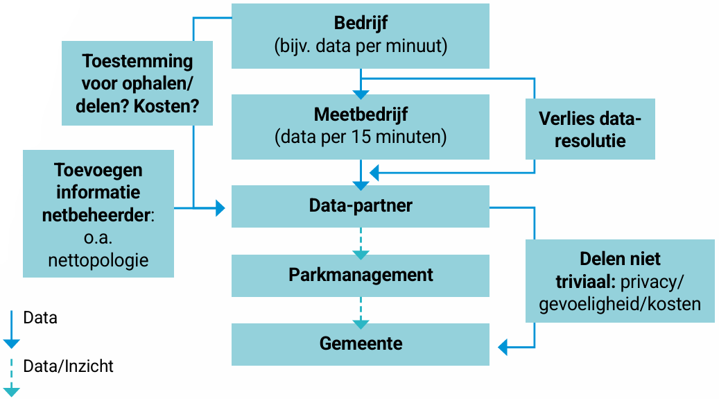 Historische data is via netbeheerder of meetbedrijf te verkrijgen. Dit betreft 15 minuten waardes, die alleen door de data-eigenaar (bedrijf) opgevraagd kunnen worden. Via een mandaat kan het bedrijf anderen machtigen namens het bedrijf de data op te halen. Parkmanagement organisaties of andere gemachtigde organisaties maken met de bedrijven afspraken met wie zij de data mogen delen. Dat gemeentes toegang hebben is zeker niet vanzelfsprekend.